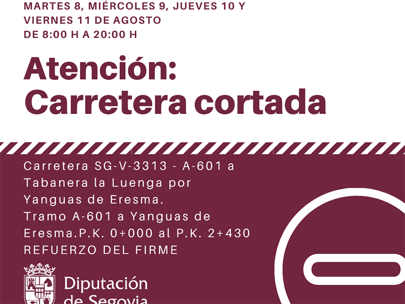 La Diputación pide disculpas de antemano a los usuarios de esta carretera porque, para la correcta realización de estos trabajos, que contribuirán a garantizar la seguridad vial de la zona, será necesario cortar al tráfico el tramo entre la autovía A-601 y Yanguas de Eresma los días 8, 9, 10 y 11 de agosto de 8:00 horas a 20:00 horas. No obstante, para facilitar el acceso a ambos municipios, el tráfico será desviado por la autovía A-601 y la carretera provincial SG-V-3310 de Tabanera la Luenga a Yanguas de Eresma y, además, durante las noches la carretera estará abierta a la circulación.