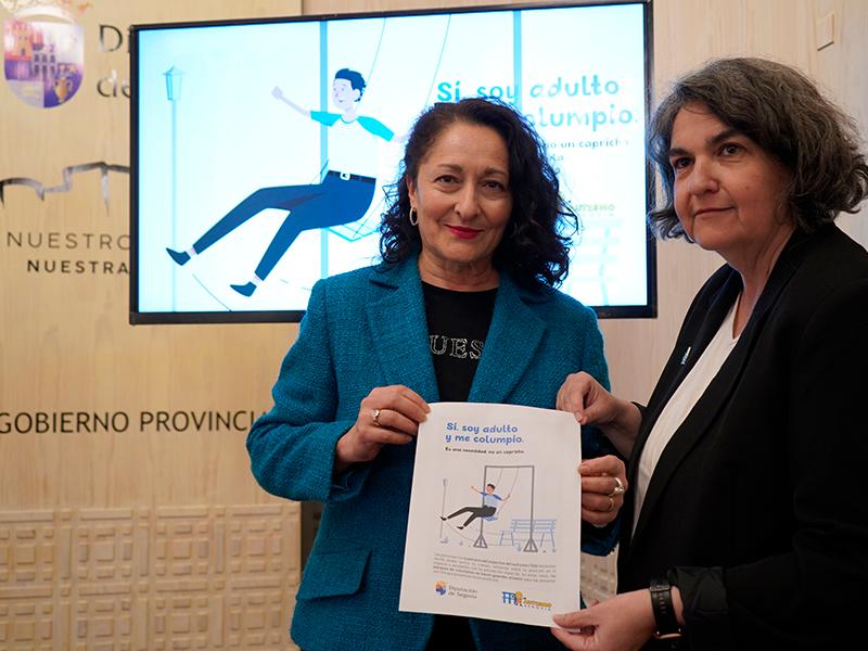 La diputada de Asistencia a Municipios e Igualdad, Pilar Martín y la presidenta de Autismo Segovia, Susana Guri han presentado esta mañana la iniciativa ‘Sí, soy adulto y me columpio’, impulsada por la asociación y apoyada desde la institución provincia; con el fin de sensibilizar a toda la población de la provincia y también a los ayuntamientos, de manera que se normalice en uso de columpios en parques infantiles por parte de las personas con Autismo, tengan la edad que tengan.