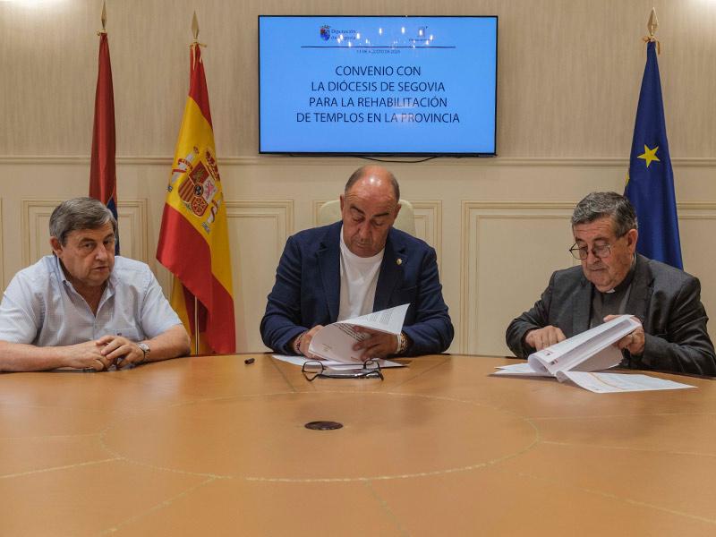 La Diputación Provincial y el Obispado de Segovia han rubricado un año más el convenio de colaboración que permite llevar a cabo actuaciones de reparación y conservación en templos repartidos por el territorio. El presidente de la institución provincial, Miguel Ángel de Vicente, y el vicario general de la Diócesis, Ángel Galindo, han sido los encargados de firmar un acuerdo que contempla una fórmula de cofinanciación en la que cada una de las entidades aporta 150.000 euros.