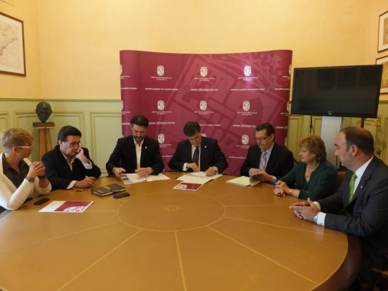 El Presidente de la Diputación, Francisco Vázquez, acompañado del Diputado del Área de Asuntos Sociales y Deportes, Miguel Ángel de Vicente, ha rubricado el acuerdo de subvención con los alcaldes del Real Sitio de San Ildefonso, José Luis Vázquez, de Prádena, María Luisa Quintana, de Cuéllar, Jesús García y de Cantalejo, José Antonio Sanz como máximos representantes de los municipios en los que se ubican las instalaciones que sirven de sede a los cuatro Centros Agrupados de Acción Social de la provincia.