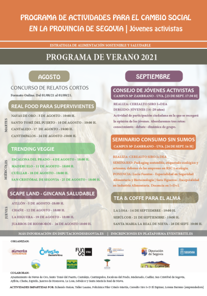 La Diputación de Segovia, en colaboración con el Ayuntamiento de Segovia, la Universidad de Valladolid y los cuatro Grupos de Acción Local, impulsa un programa de actividades durante los meses de agosto y septiembre en el marco de la Estrategia de Alimentación Sostenible y Saludable. Este programa cuenta con un total de 19 actividades, las cuales se llevarán a cabo en diferentes municipios de la provincia.